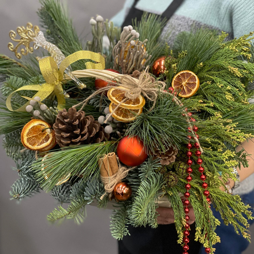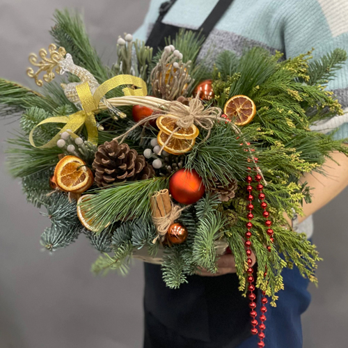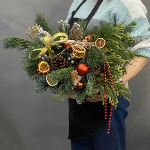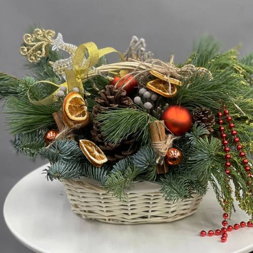 Композиция в корзине "Лесная история" из нобилиса, корицы и зимнего декора