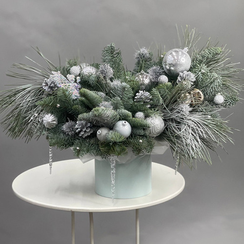 Композиция в шляпной коробке "Падал прошлогодний снег" из нобилиса и зимнего декора