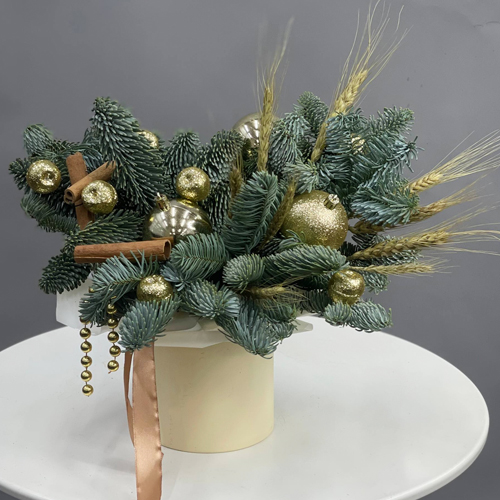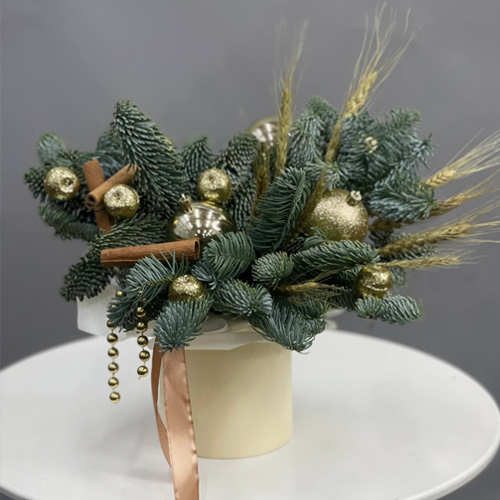 Композиция в шляпной коробке "Золотая сказка" из нобилиса и пшеницы