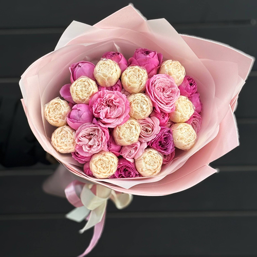 Букет из шоколадных пионов и кустовых пионовидных роз Мисти Баблз и Леди Бомбастик (40 см)