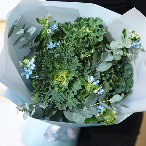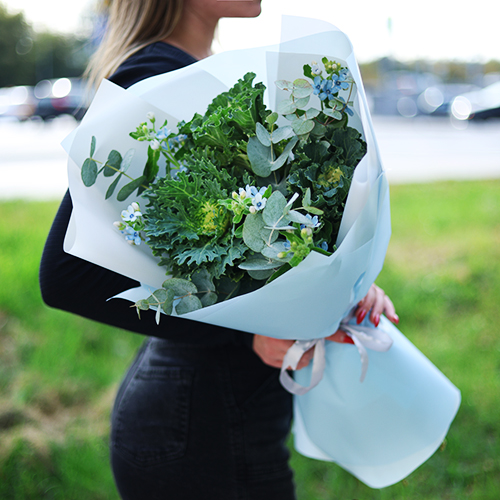 Букет "Джентельмен" из брассики, эвкалипта и оксипеталума