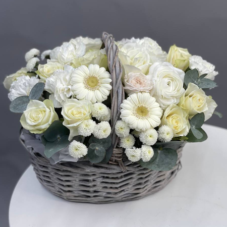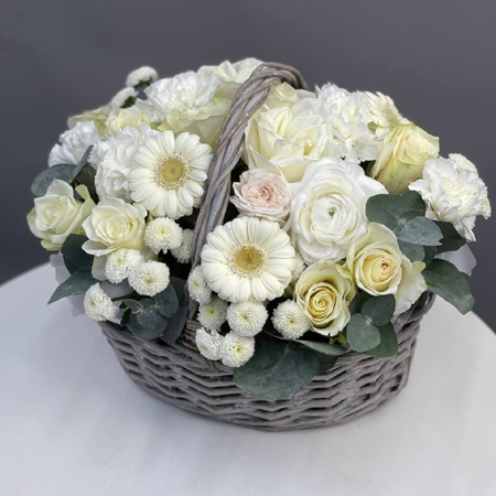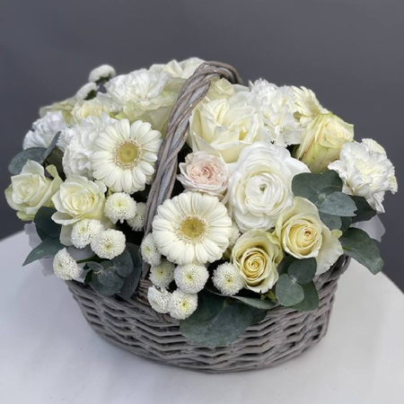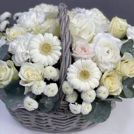 Композиция в корзине диантусов, гербер, эвкалипта, хризантем Ньютон и роз кения