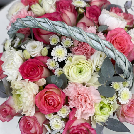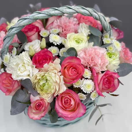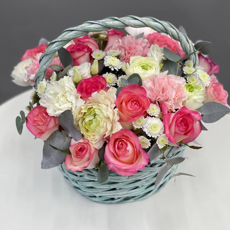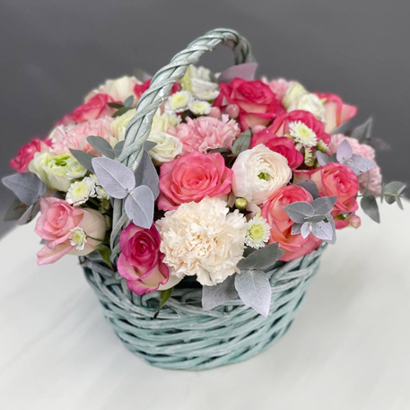 Композиция в корзине диантусов, роз Джумилия, эвкалипта, хризантем сантини, эустом и ранункулюсов