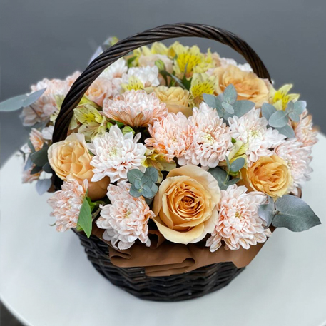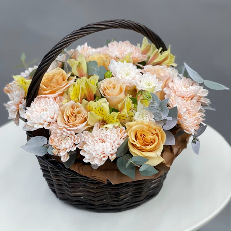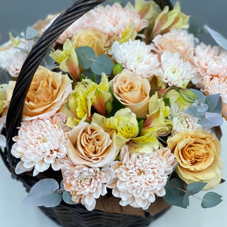 Композиция в корзине роз Эквадор, эвкалипта, хризантем и альстромерий