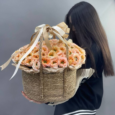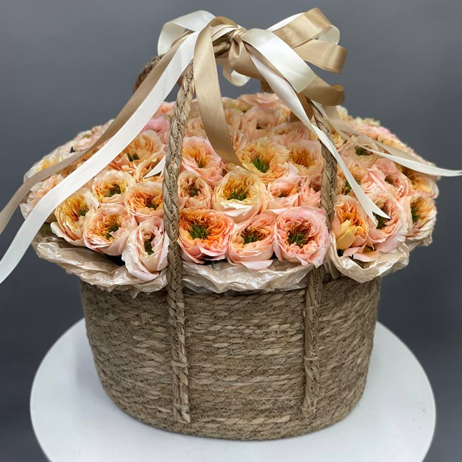 Композиция в сумке "Мандарин" из 101 пионовидной розы Питер Парк