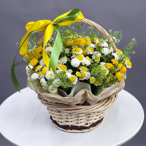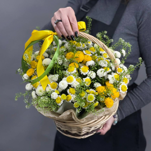 Композиция в корзине "Луга счастья" из хризантем сантини Сан Ап и Ньютон