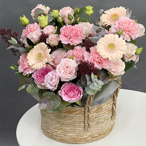 Композиция в сумке "Мадонна" из кустовых роз Бомбастик, гербер, эвкалипта, эустом, роз кения и диантусов