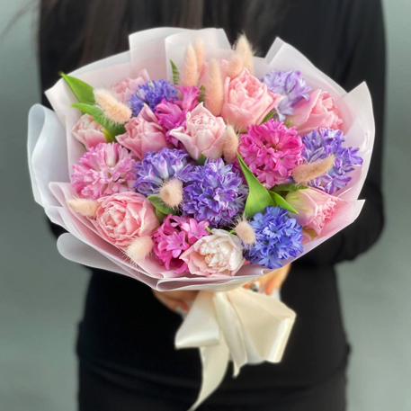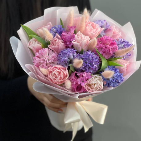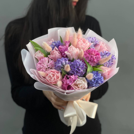 Букет "Крошка моя" из гиацинтов, тюльпанов и лагуруса