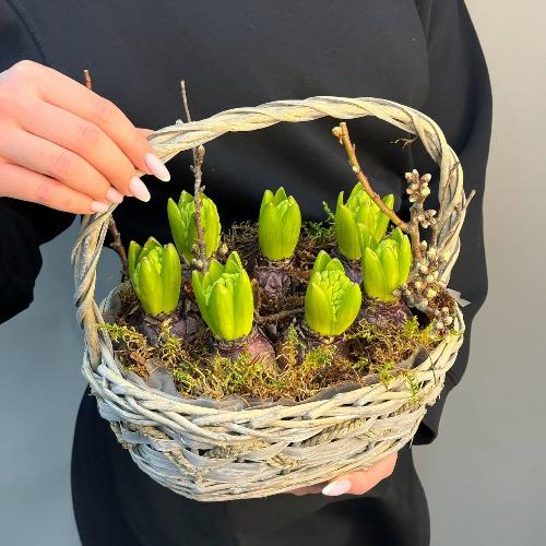Интерьерная композиция с луковичными гиацинтами в корзине