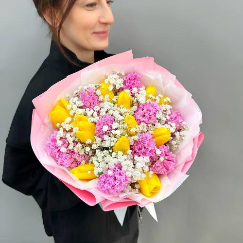 Яркий микс с гиацинтами, тюльпанами и гипсофилой
