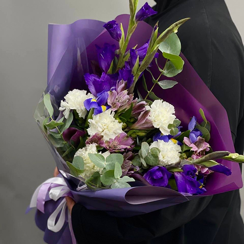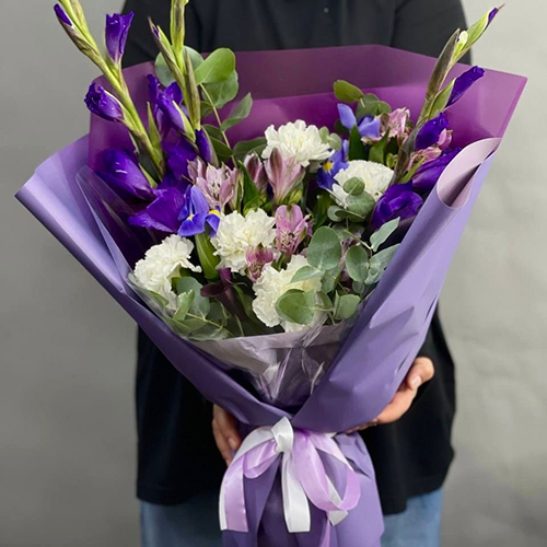 Букет "Пурпур" из гладиолусов, ирисов, диантусов и эустом