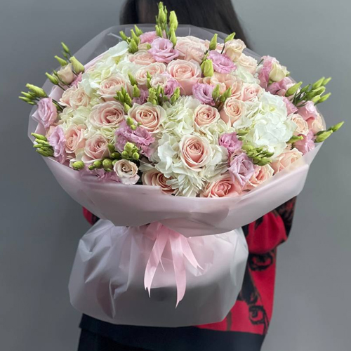 Букет "Нежная лазурь" из гортензий, эустом и роз Аваланж