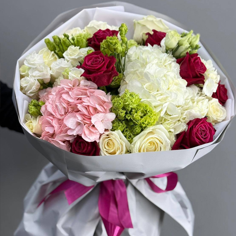Букет "Зеро" из роз, гортензии и эустом