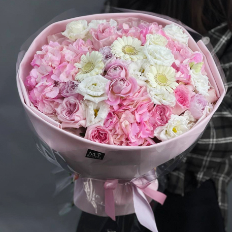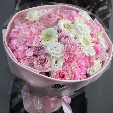Букет "Зефирный" из роз Эквадор, гортензий, гербер, эустом и кустовых роз