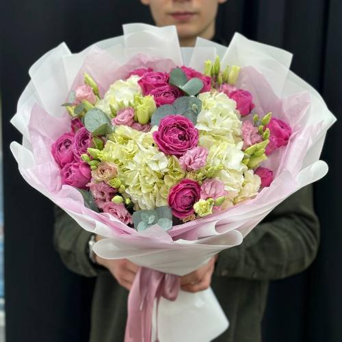 Микс-букет с пионовидными розами, белыми гортензиями и эустомой