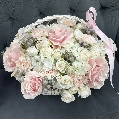 Нежная композиция в корзине с французскими розами, гортензиями и гвоздикой