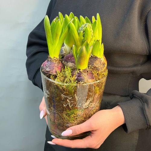 Интерьерная композиция с луковичными гиацинтами в стеклянной вазе ( 5 шт)
