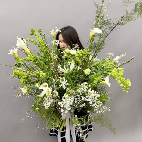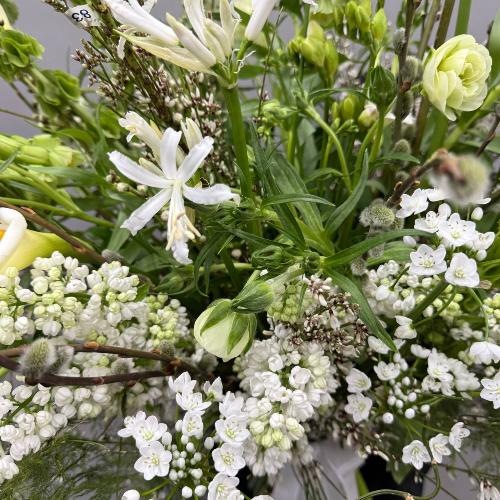 Садовый букет с сиренью, каллами и цветущими ветками