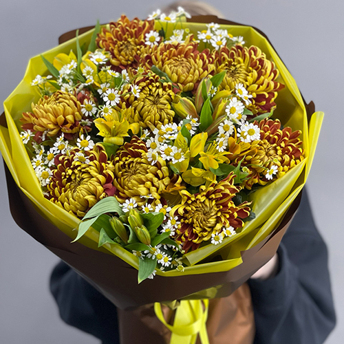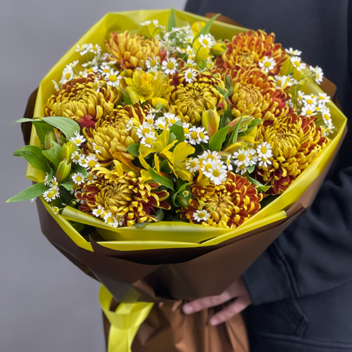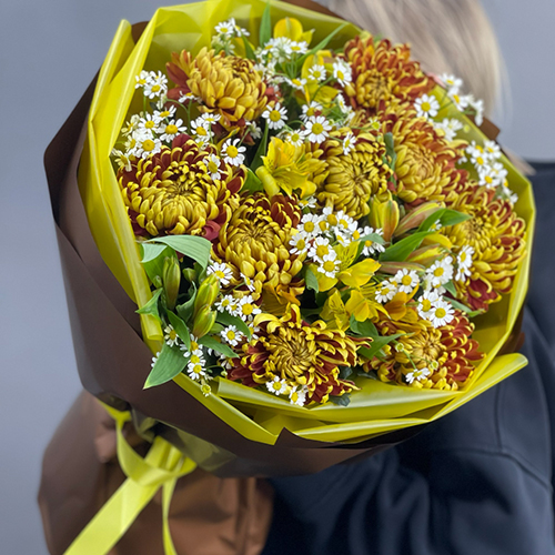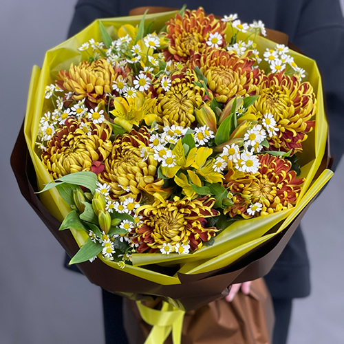 Букет "Мимоза" из тигровых хризантем Бигоуди, альстромерий и ромашек