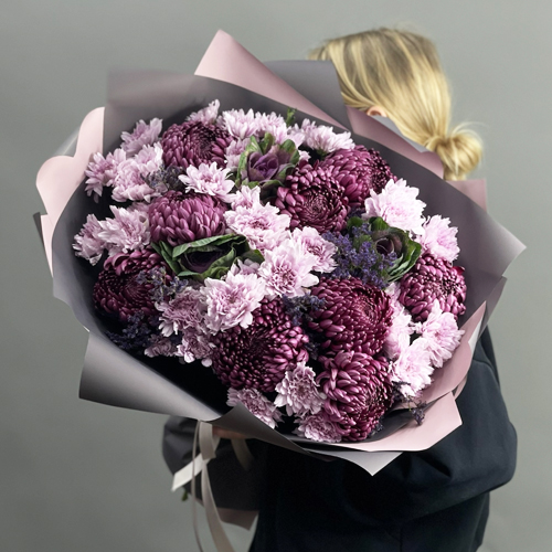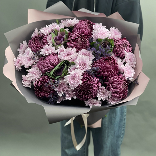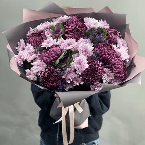Букет "Виолетта" из хризантем Бигоуди, лимониума, брассики и кустовых хризантем