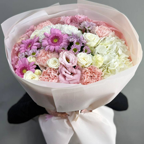 Букет "Облако нежности" из хризантемы, кустовых пионовидных роз Мисс Бомбастик, диантусов, гортензии и эустом