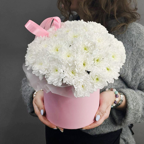 Композиция в шляпной коробке "Хит" из белых кустовых хризантем