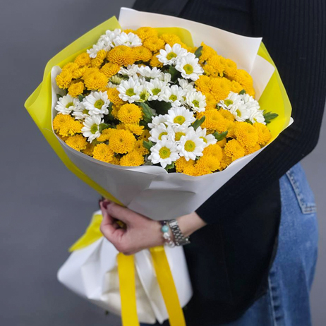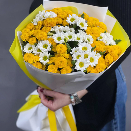 Букет "Солнце моё" из 15 хризантем сантини микс