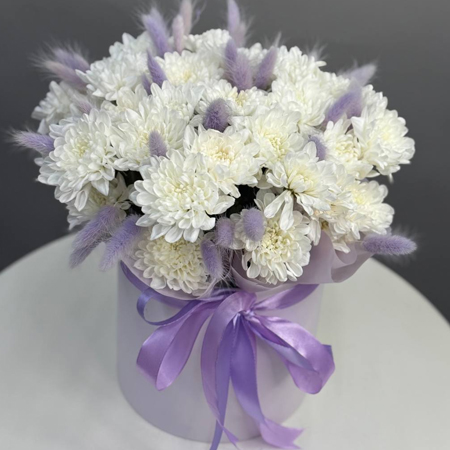 Композиция в шляпной коробке "Лавандовый зефир" из белых кустовых хризантем и лагуруса