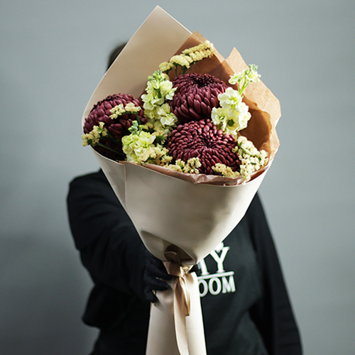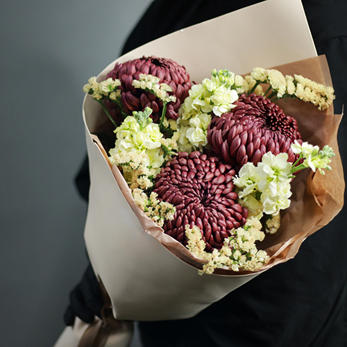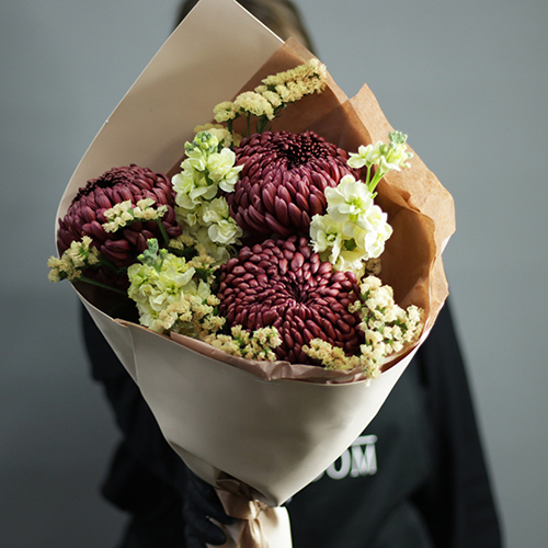 Букет "Корица" из хризантем Бигоуди, статицы и маттиол