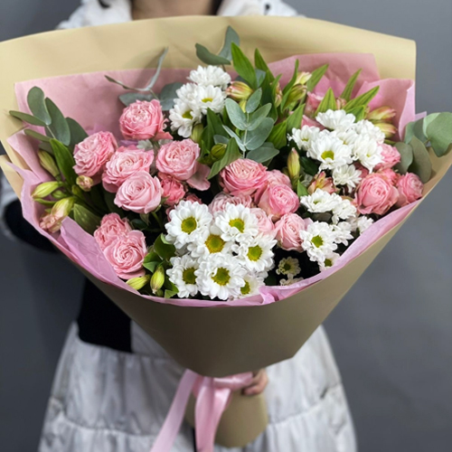 Букет "Лавина" из кустовых пионовидных роз Бомбастик, альстромерий и хризантем сантини