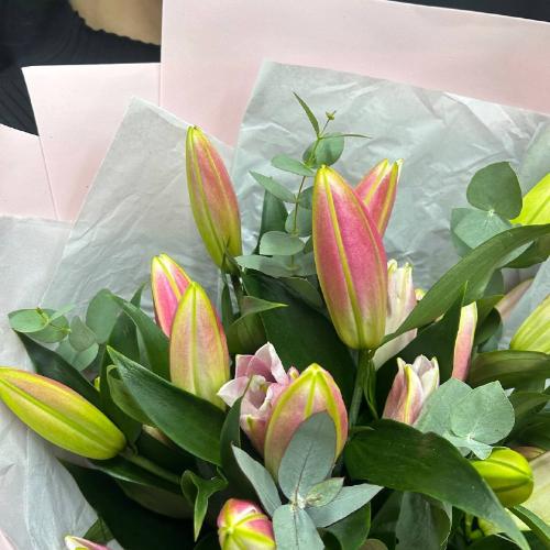 Монобукет из 5 розовых лилий с эвкалиптом в розовой плёнке