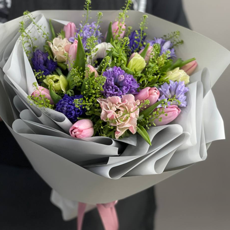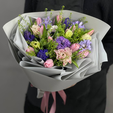 Букет "Кабриолет" из анемонов, гиацинтов, тюльпанов и гринбелла