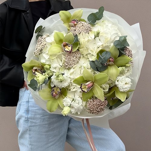 Букет "Эдем" из гортензии, орхидей, эустом, эвкалипта и озатамнуса