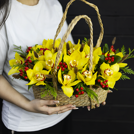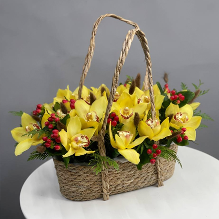 Композиция в сумке из орхидей, лагуруса и гиперикума