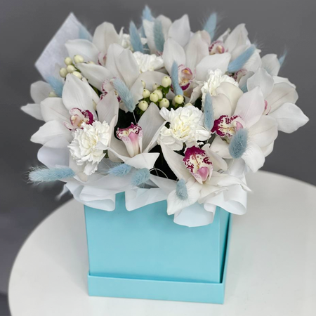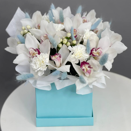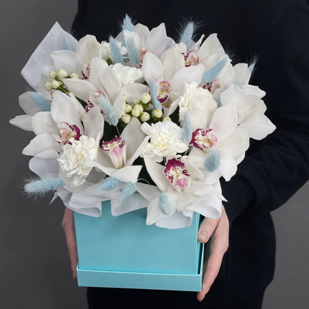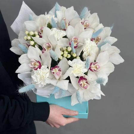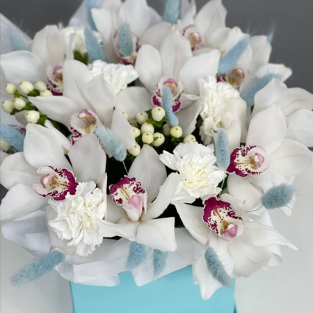 Композиция в коробке из орхидей, гиперикума, диантусов и лагуруса