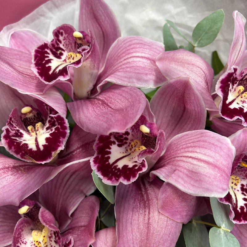 Монобукет из 7 фиолетовых орхидей с эвкалиптом в малиновой упаковке