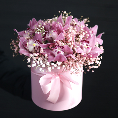 Композиция в шляпной коробке из орхидей и гипсофилы