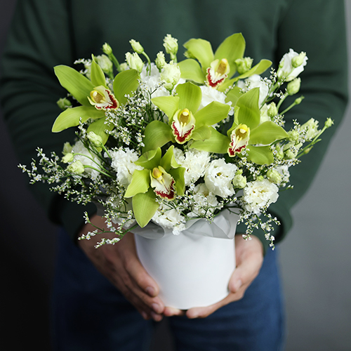Композиция в шляпной коробке "Колибри" из лаймовых орхидей и эустом