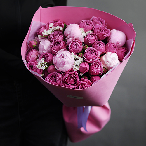 Букет "Ласковый май" из пионов Сара Бернар, пионовидных роз и аллиума