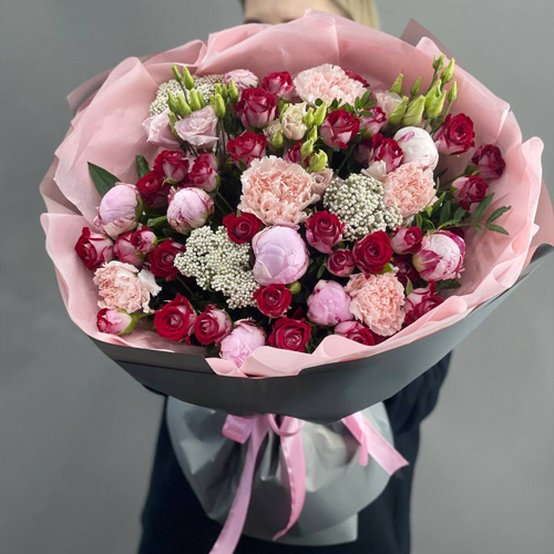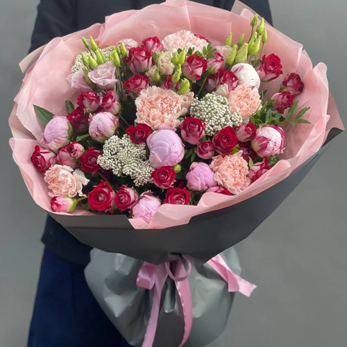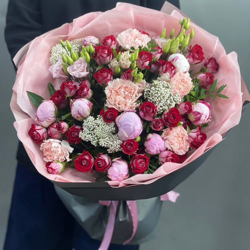 Букет "Орландо" из пионов Сара Бернар, кустовых рубиновых роз, диантусов и озатамнуса