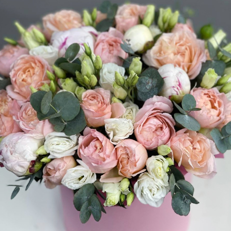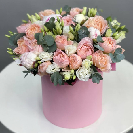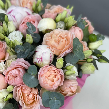 Композиция в шляпной коробке "Код Да Винчи" из эустом, кустовых пионовидных роз Джульетта и пионов