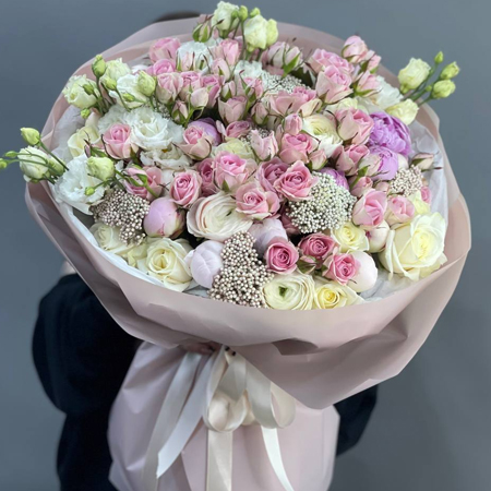Букет "Катрин" из пионов, ранункулюсов, кустовых роз, озатамнуса и эустом