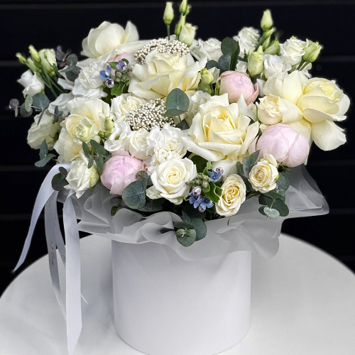 Композиция в шляпной коробке "Эмма" из пионов, белых роз, эустом, оксипеталума, диантусов и озатамнуса
