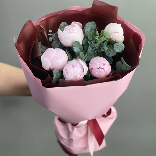 Букет 5 розовых пионов Сара Бернар с эвкалиптом