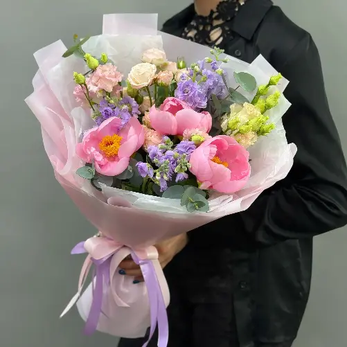 Букет с пионами, маттиолой, эустомой и розами " Прованс"