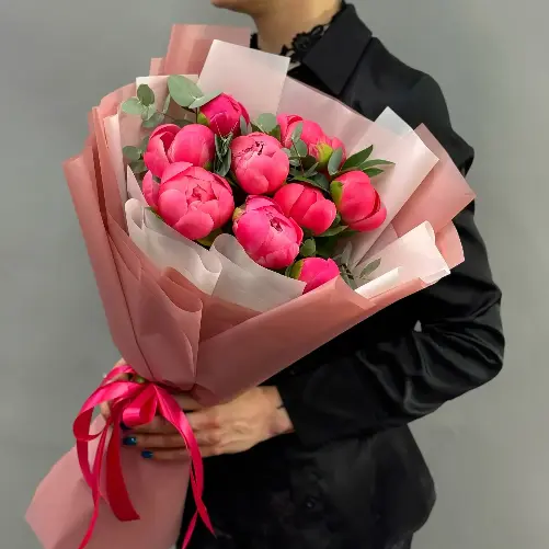 Букет из 9 коралловых пионов с эвкалиптом в двухслойной упаковке