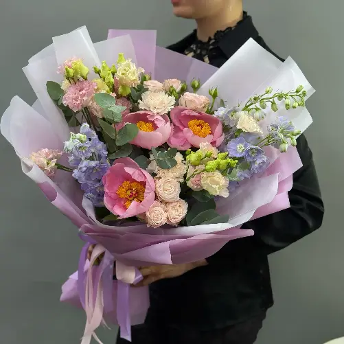 Авторский букет " Яркие чувства" с пионами, дельфиниумом,эустомой и розами