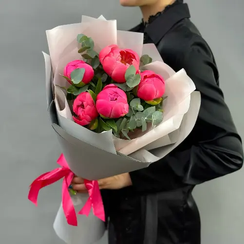 Букет " Элизиум" из 5 коралловых пионов с эвкалиптом