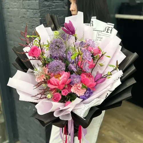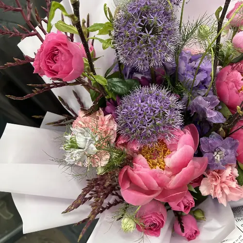 Сезонный букет с ветками магнолии, пионами и аллиумом