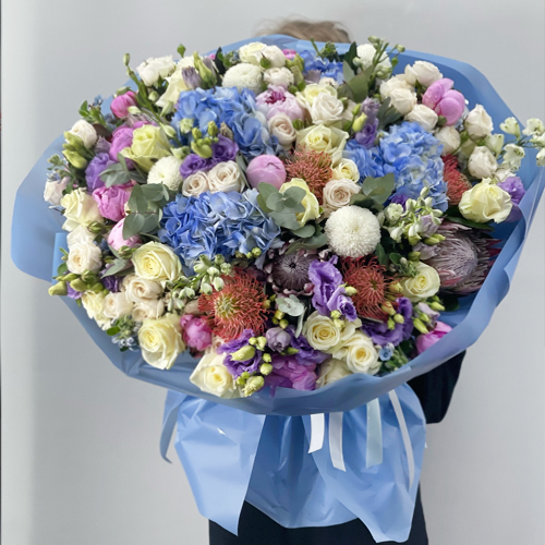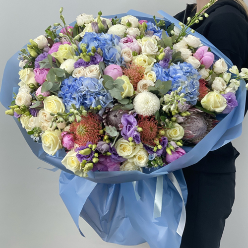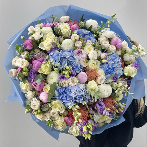 Букет "Девичьи слёзы" из гортензий, пионов, протей, дельфиниума, роз, хризантем Момоко, эустом, оксипеталума и лейко